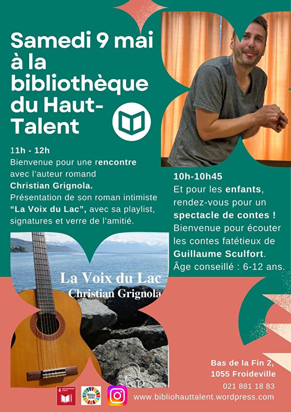 Cette activité sera suivie dès 11h d’une rencontre-dédicace par un auteur de la région : Christian Grignola, habitant de Poliez-Pittet et originaire du Tessin. Son roman, « La voix du Lac », un récit de vie, d’amours et de musique, est aussi un clin d’oeil à ses deux langues.